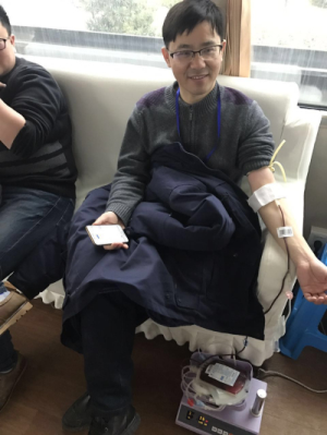 “小汤,今天你又来啦,这次可不能再晕倒喔”,正坐在椅子上采血的我见到本部门的小汤进来检查血样就与他开玩笑,小汤也不示弱“去年是第一次,没有经验,现在让我站着献也没事”,小汤躺下身子继续说“我比较胖,今天抽400CC”,接近目标时,小汤的额头上渗出了些许汗珠,医生见状,忙问“觉得不舒服吗”,小汤坚定回答:“没事,抽到400CC”。