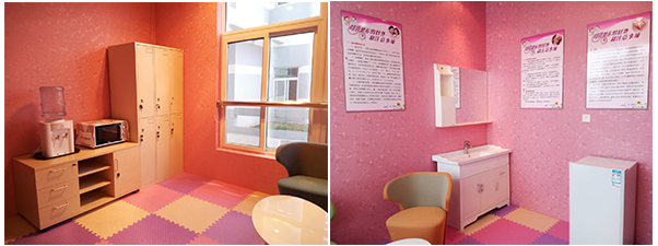 “爱心母婴室”设置在活动室二楼,面积11平方米,可容纳4人同时哺乳。母婴室内设施完善,配备冰箱,饮水机,储物柜,微波炉,洗手池,宣传标识牌,软座沙发等现代化设施,可以为哺乳妈妈们提供一个干净卫生、温馨舒适、安全私密的哺乳环境。