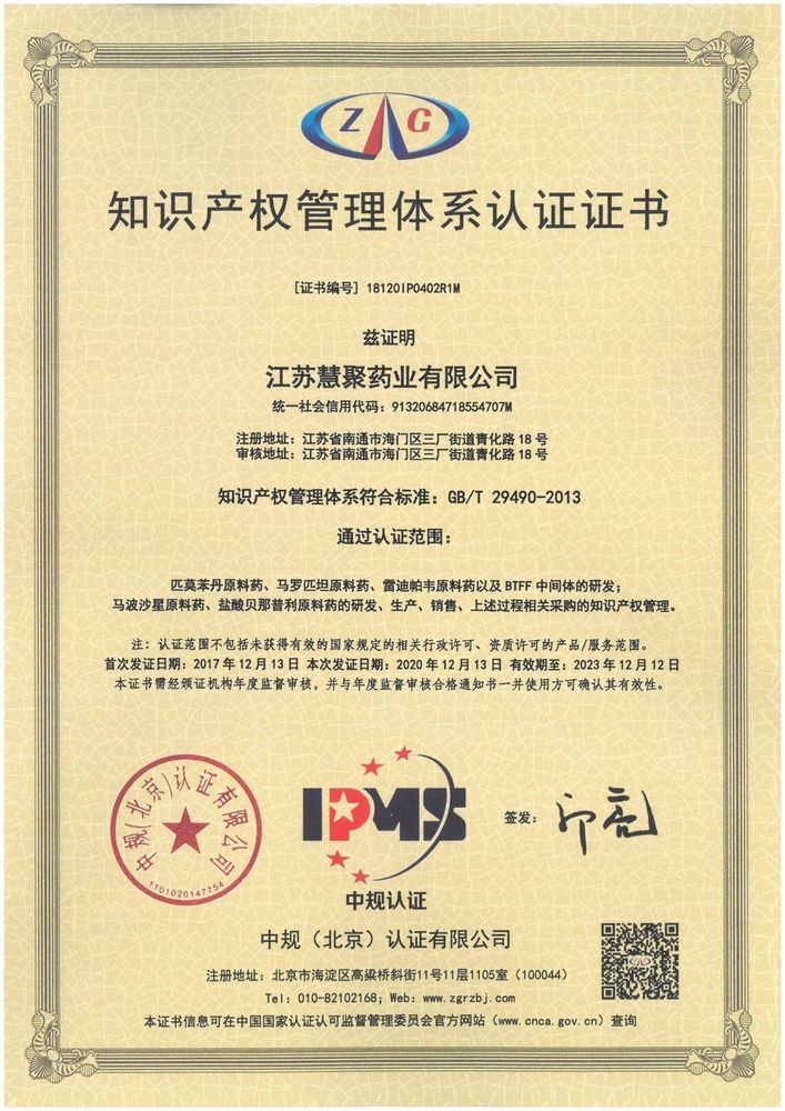 2020年12月3-4日,中规(北京)认证有限公司审核专家组对公司进行为期两天的知识产权管理体系再认证审核,此次再认证审核,专家组对我公司知识产权管理体系运行的适宜性和有效性给予认可和肯定,最终慧聚药业顺利通过此次再认证。未来,我公司将继续贯彻《企业知识产权管理规范》,促进知识产权创新发展意识的提高,增强对专利、商标等知识产权的应用和保护能力,将慧聚药业打造为知识产权意识强、创新意识强、产业化效益显著和专业人才齐全的创新型企业。